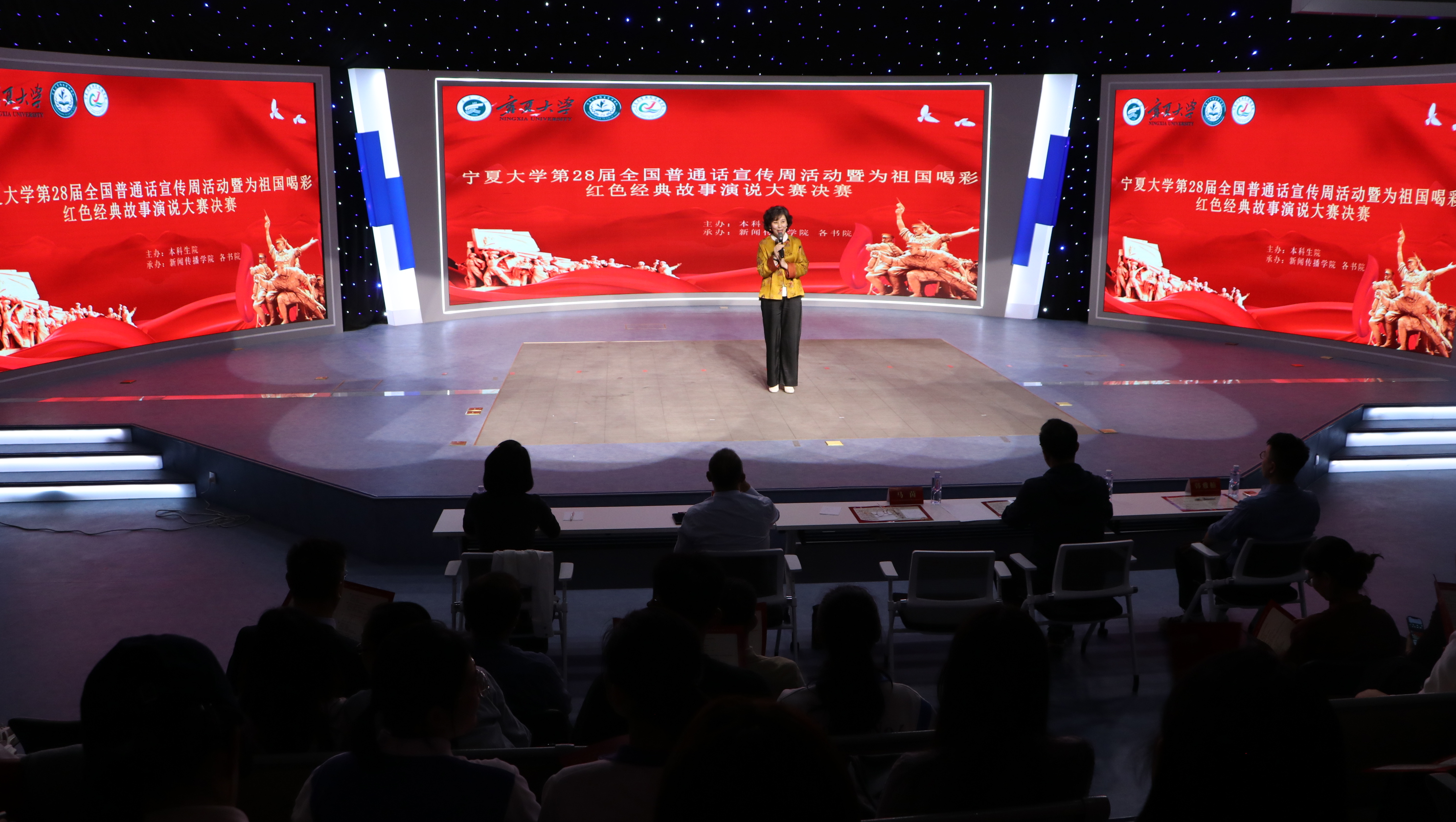为厚植家国情怀,传承红色基因,感悟经典传承,在中华人民共和国成立76周年之际,9月29日晚,宁夏大学“为祖国喝彩——红色经典故事演说大赛”总决赛暨展演在贺兰山校区新闻传播学院演播厅精彩呈现。