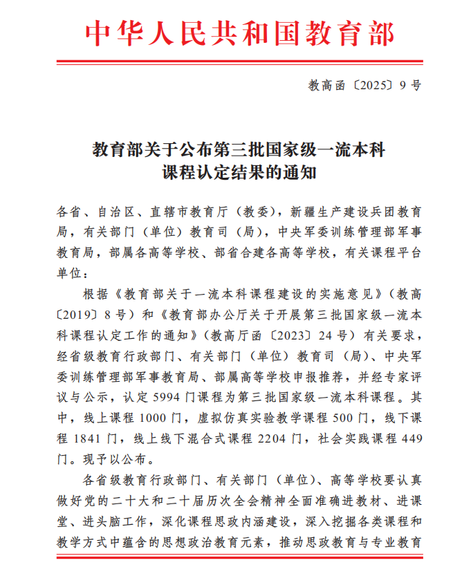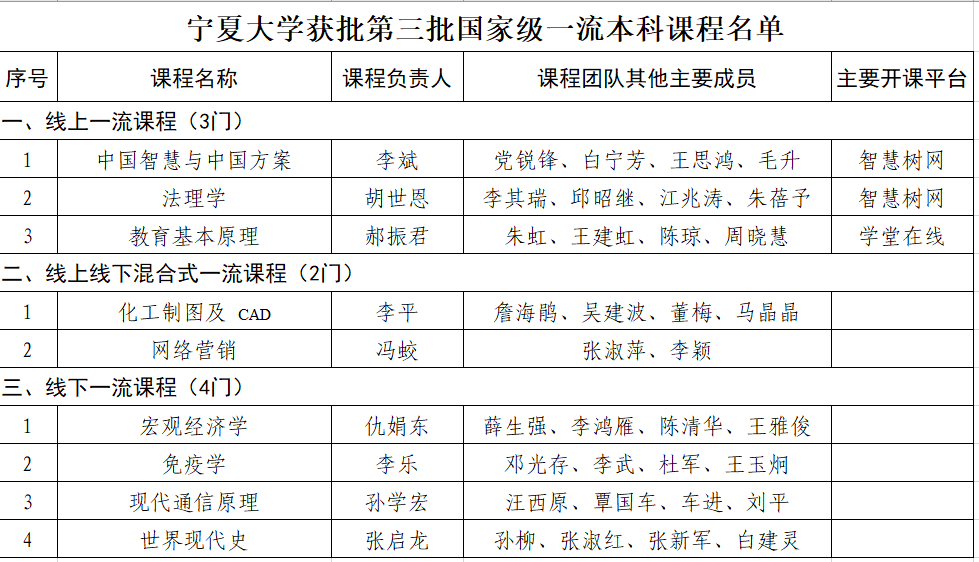 近日,教育部公布了第三批国家级一流本科课程认定结果。宁夏大学9门课程成功获批国家级一流本科课程,其中,线上课程3门,线下课程4门,线上线下混合式课程2门。这不仅是宁夏大学教育教学改革成果的集中体现,更是学校迈向教育高质量发展的重要里程碑。